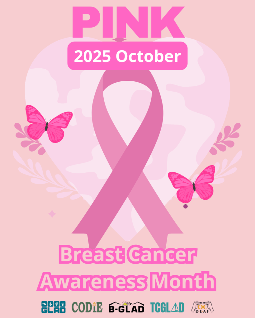 ID: Light pink background flyer. In the center is a large heart-shaped earth image with silhouettes of different countries, dotted with two hot pink butterflies on the left and right sides. Behind the heart-shaped earth are several leaf branches sprouting from all sides. From top to bottom is large text in pink and white, “PINK 2025 October” and “Breast Cancer Awareness Month”. At the bottom are the logos of GLAD, CODIE, B-GLAD, TTCGLAD, and CDeaf.