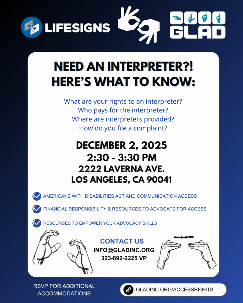 ID: Dark to light blue gradient background flyer. On the top are the two logos of LifeSigns and GLAD. In the center is an interpreted icon. Inside the white display box with rounded corners with black and blue text. Near the bottom of the edge of the box are two images of fingerspelled handshapes signing “Communication” and “Equality”. On the bottom of the flyer is a website link on the right side “GLADinc.org/AccessRights”. On the left corner is white text, “RSVP for Additional Accommodations”.