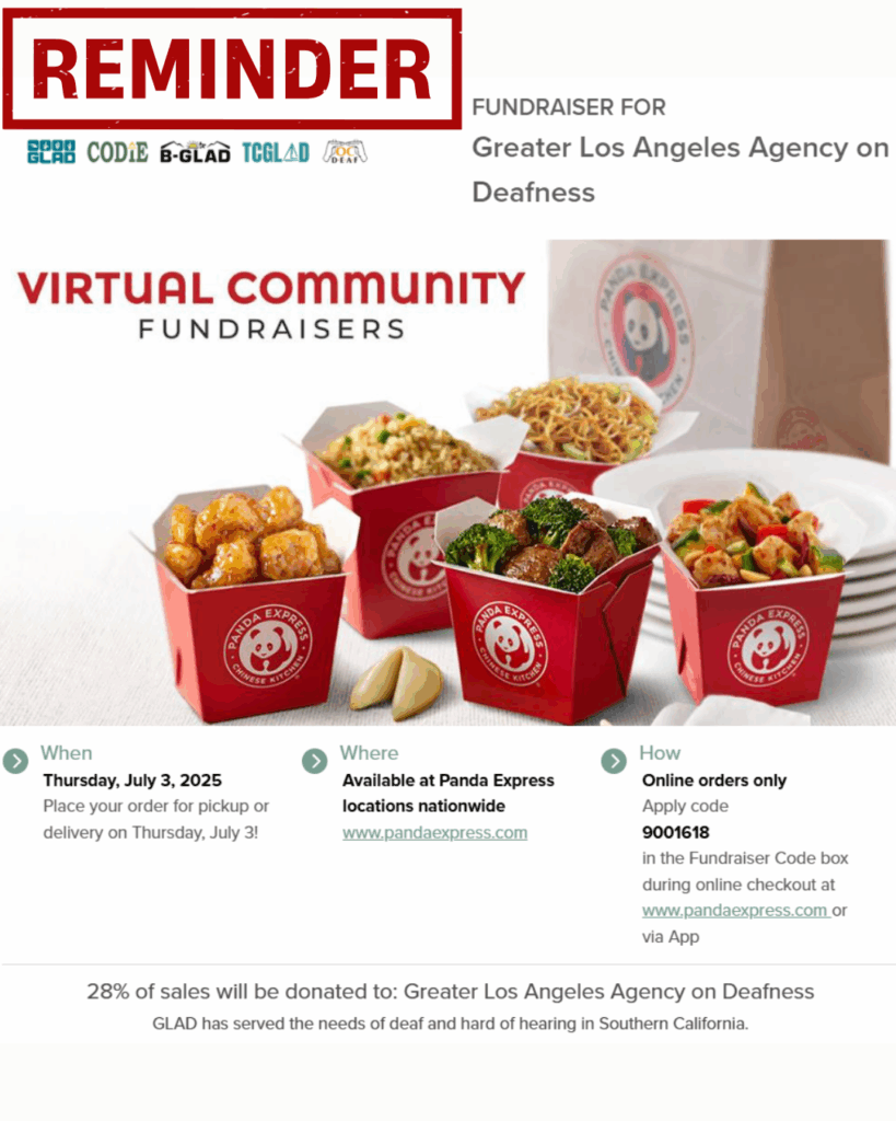 Friendly Reminder! Tomorrow GLAD, CODIE, B-GLAD, TCGLAD and OCDEAF are having a virtual fundraiser with Panda Express restaurant!
